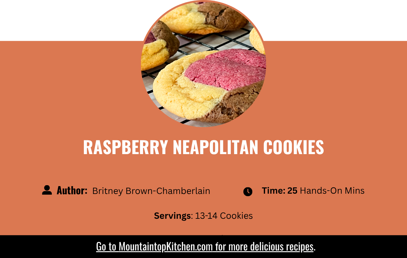 In our Mountaintop Kitchen, these Raspberry Neapolitan Cookies grew from a simple idea: three classic flavors, brought together in one dough that feels both familiar and new. The name “Neapolitan” traces back to the Italian tradition of pairing chocolate, vanilla, and strawberry, most famously in tri-color ice cream inspired by the flavors of Naples. Over time, it became a symbol of balance and contrast, each element distinct but better together. Here, that idea takes shape in a soft, bakery-style cookie any home baker can pull off.