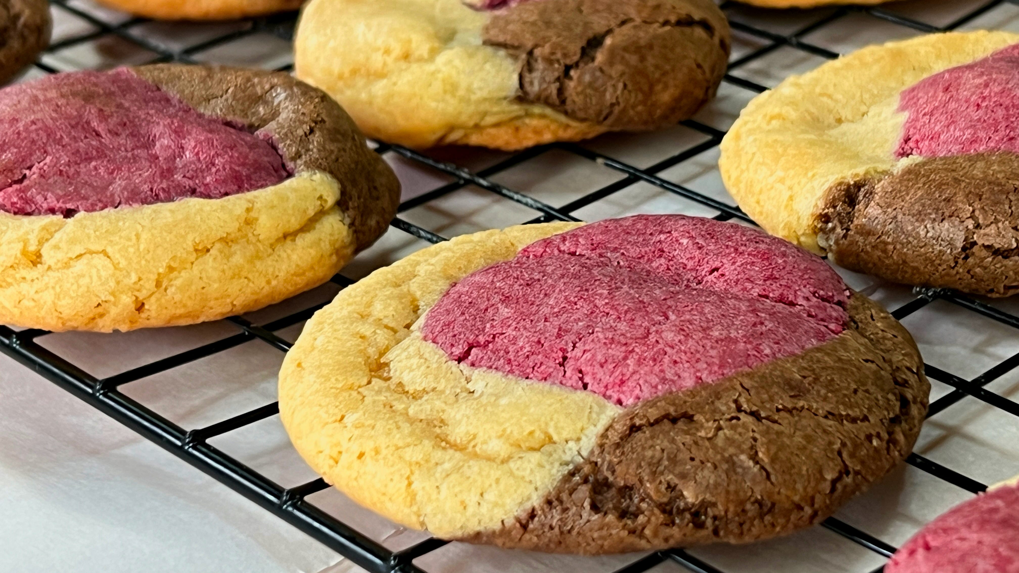 Three flavors in one bite: raspberry, chocolate, and vanilla layered into a single, balanced cookie