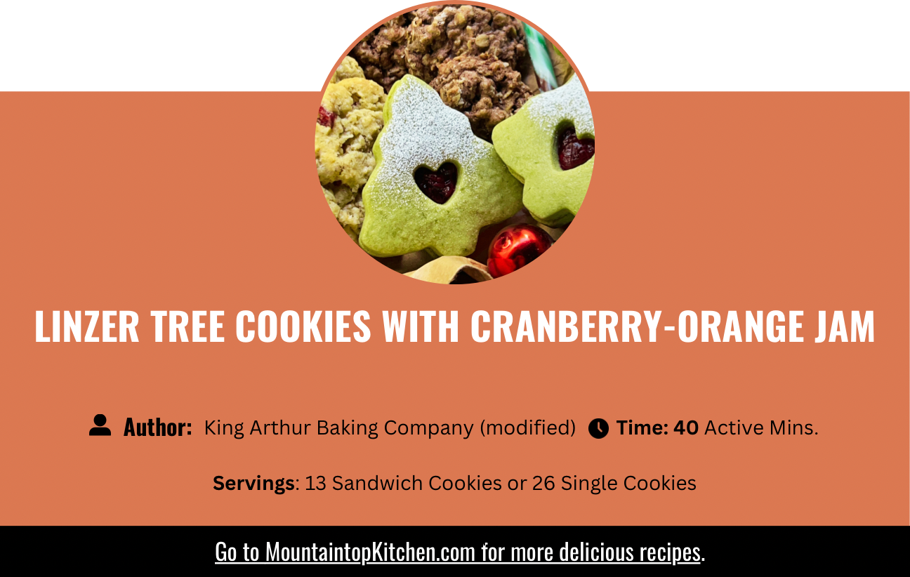 “Up in the Mountaintop Kitchen, we’re turning classic Linzer cookies into a holiday showstopper. These buttery matcha cookies bake up soft and pale green, then get filled with jewel-toned cranberry–orange jam and finished with a snowfall of powdered sugar. Elegant, festive, and quietly bold—just the way I like my Christmas cookies”